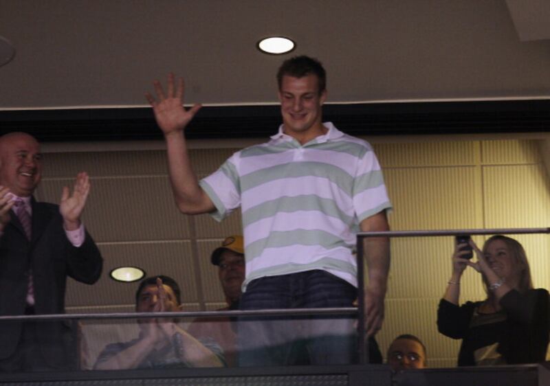 Through the years BOSTON, MA - DECEMBER 19: Tight end Rob Gronkowski #87 of the New England Patriots acknowledges the fasn during the game between the Boston Bruins and the Montreal Canadiens at the TD Garden on December 19, 2011 in Boston, Massachusetts. (Photo by Bruce Bennett/Getty Images) (Bruce Bennett/Getty Images)