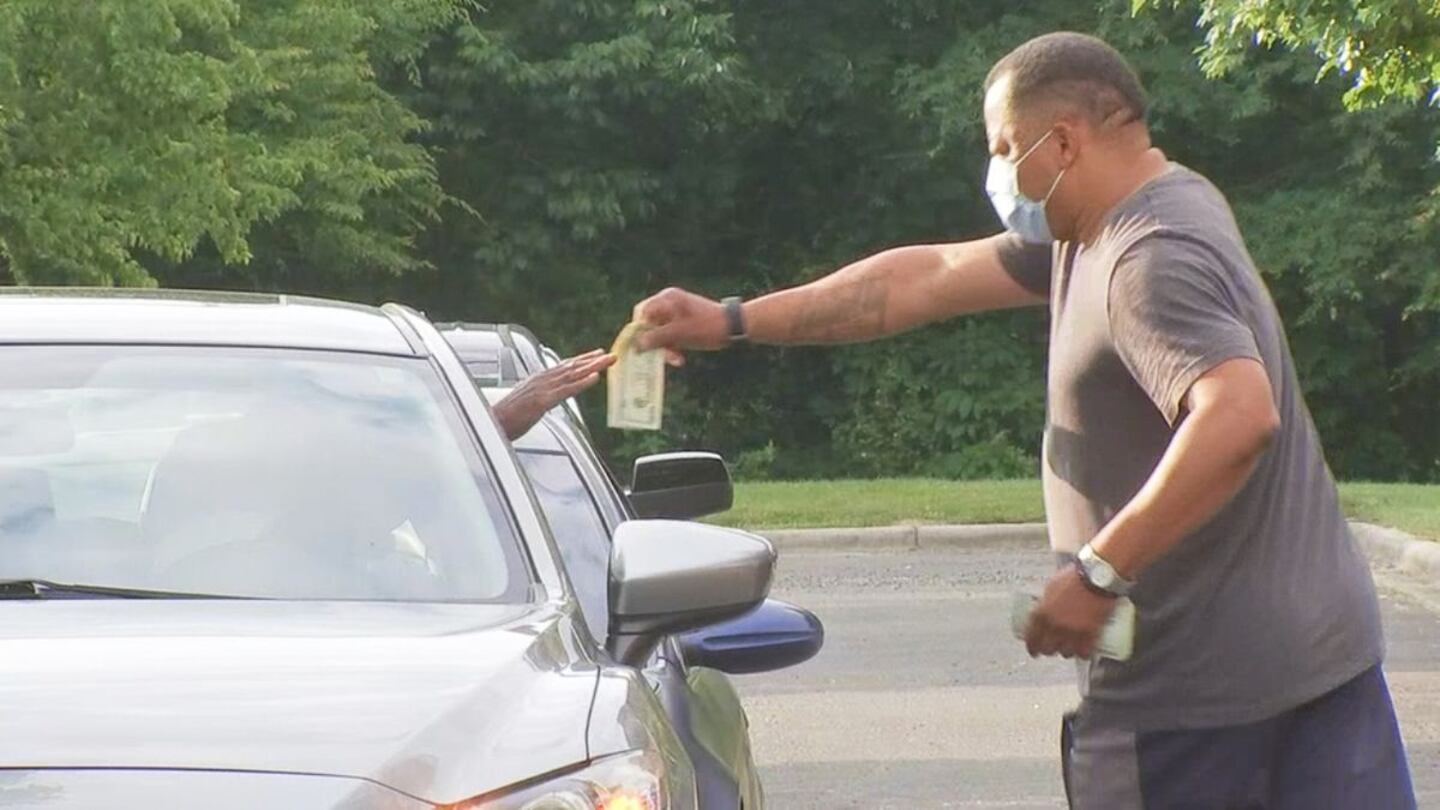 Retired Charlotte-Mecklenburg police officer Benson Ratlif went car to car handing out the cash Thursday.