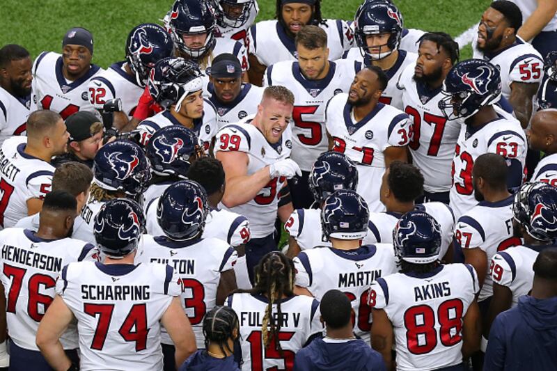 Photos: J.J. Watt through the years 2019: J.J. Watt of the Houston Texans gives the team a pep talk before a game against the New Orleans Saints at the Mercedes Benz Superdome on September 9, 2019, in New Orleans. (Jonathan Bachman/Getty Images)