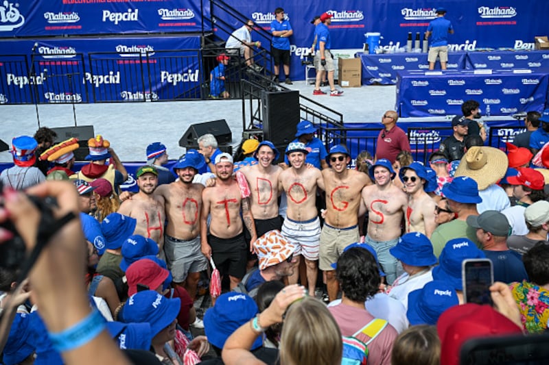 Nathan's Annual Hot Dog Eating Contest NEW YORK, NEW YORK - JULY 04: Contestants compete in the 2023 Nathan's Famous Fourth of July International Hot Dog Eating Contest on July 4, 2023 at Coney Island in the Brooklyn borough of New York City. The men's contest was postponed due to thunderstorms but later happened without spectators allowed into the "arena." The annual contest, which began in 1972, draws thousands of spectators to Nathan’s Famous located on Surf Avenue. (Photo by Alexi J. Rosenfeld/Getty Images) (Alexi Rosenfeld/Getty Images)