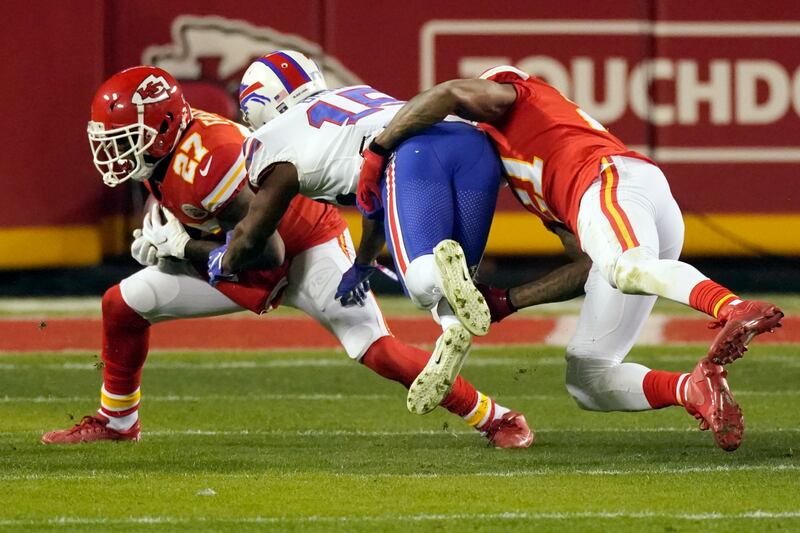 Chiefs top Bills 38-24 in AFC title game, head back to Super Bowl Buffalo Bills running back T.J. Yeldon (22) is tackled by Kansas City Chiefs safety L'Jarius Sneed (38) and safety Tyrann Mathieu (32) during the second half of the AFC championship NFL football game, Sunday, Jan. 24, 2021, in Kansas City, Mo. (AP Photo/Jeff Roberson)