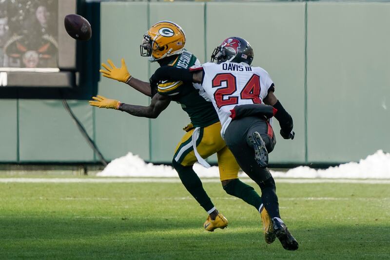 Photos: Bucs defeat Packers 31-26 in NFC title game, reach Super Bowl Tampa Bay Buccaneers' Carlton Davis (24) tries to defend against Green Bay Packers' Marquez Valdes-Scantling as he makes a 50-yard touchdown catch during the first half of the NFC championship NFL football game in Green Bay, Wis., Sunday, Jan. 24, 2021. (AP Photo/Morry Gash)