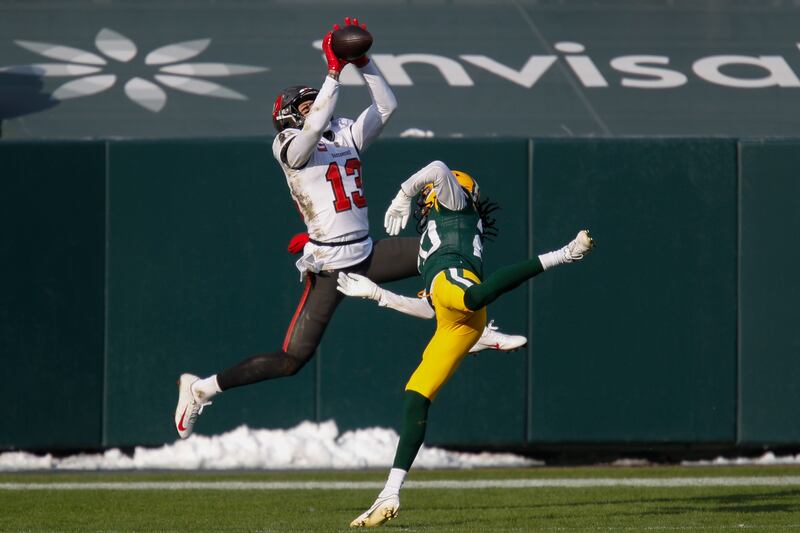 Photos: Bucs defeat Packers 31-26 in NFC title game, reach Super Bowl Tampa Bay Buccaneers' Chris Godwin (14) catches a pass against Green Bay Packers' Darnell Savage (26) during the first half of the NFC championship NFL football game in Green Bay, Wis., Sunday, Jan. 24, 2021. (AP Photo/Matt Ludtke)