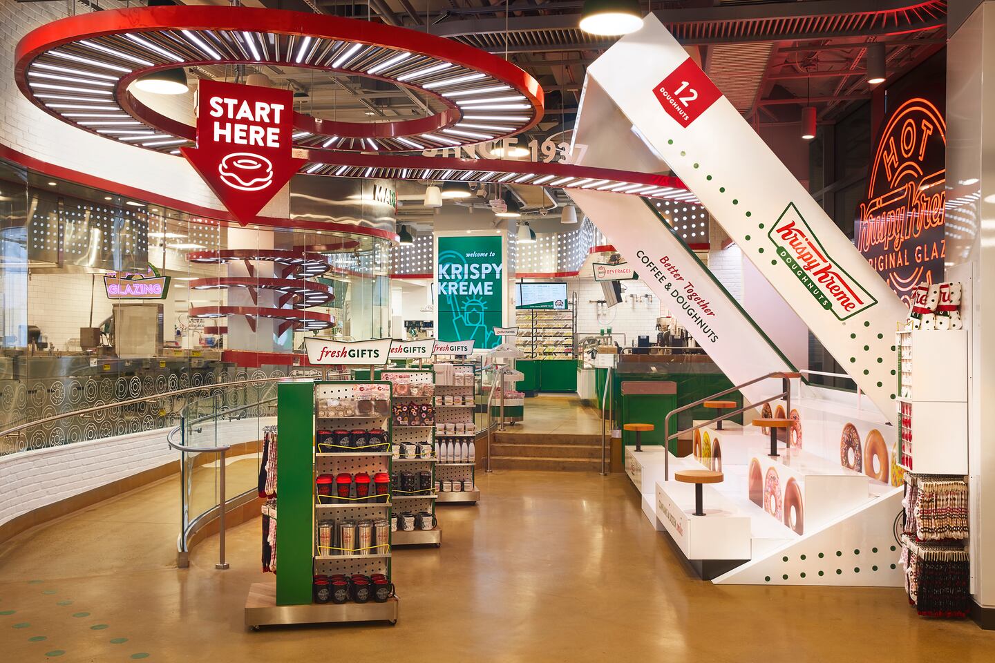 Customers can expect to see the world’s largest signature Hot Light, a doughnut-making theater that produces 4,560 doughnuts an hour and stadium‑style seating inside a faux Krispy Kreme dozens box.