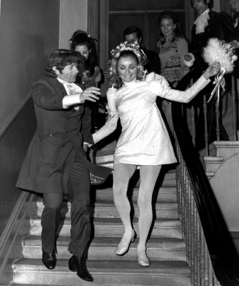 In this Jan. 20, 1968 file photo, American actress Sharon Tate and Polish-born film director Roman Polanski skip downstairs after their wedding at Chelsea Register Office in London. (AP Photo/Eddie Worth, File)