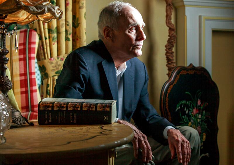 In this March 7, 2013, file photo, former Los Angeles prosecutor Vincent Bugliosi sits next to one of his books at his home in Pasadena, Calif. He died of cancer at age 80 in 2015. (AP Photo/Damian Dovarganes, File)