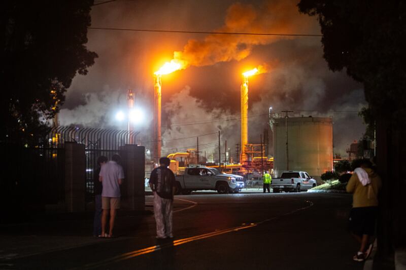 Chevron oil refinery fire EL SEGUNDO, CALIFORNIA - OCTOBER 3: People watch a fire burn at a Chevron refinery on October 3, 2025 in El Segundo, California. A big explosion around 10pm (PST) on October 03 produced a large orange blaze that could be seen from miles away from the refinery close by the Los Angeles airport. (Photo by Apu Gomes/Getty Images) (Apu Gomes/Getty Images)