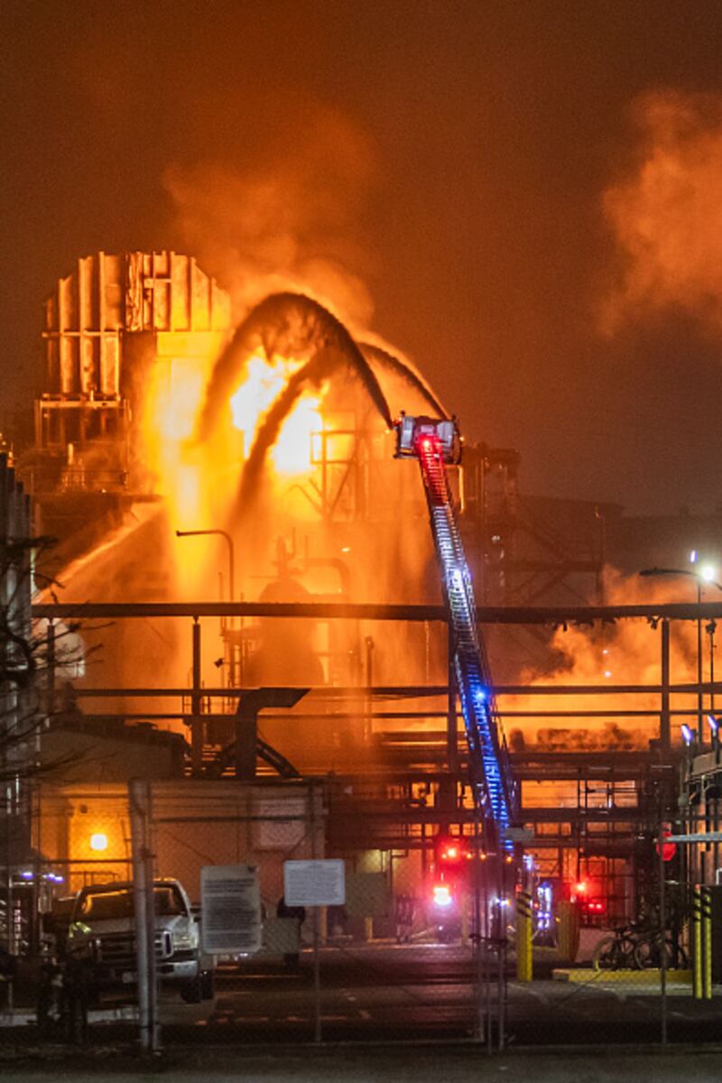 Chevron oil refinery fire EL SEGUNDO, CALIFORNIA - OCTOBER 3: Fire burns at a Chevron refinery on October 23, 2025 in El Segundo, California. A big explosion around 10pm (PST) on October 02, producing a large orange blaze that could be seen from miles away from the refinery close by the Los Angeles airport. (Photo by Apu Gomes/Getty Images) (Apu Gomes/Getty Images)