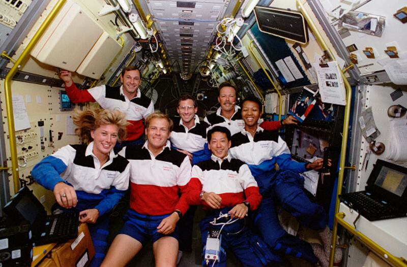 Mae Jemison African American astronaut Mae Jemison, left, smiles as suit technician Sharon McDougle performs an unpressurized and pressurized leak check on her spacsuit prior to the STS-47 Spacelab-J mission on the shuttle Endeavour, at the Kennedy Space Center, Florida, September 12, 1992. (Photo by NASA/Interim Archives/Getty Images) (Interim Archives/Getty Images)