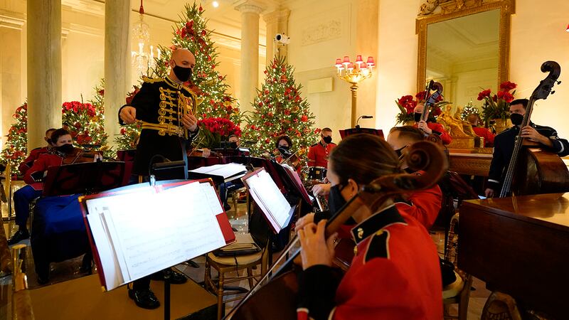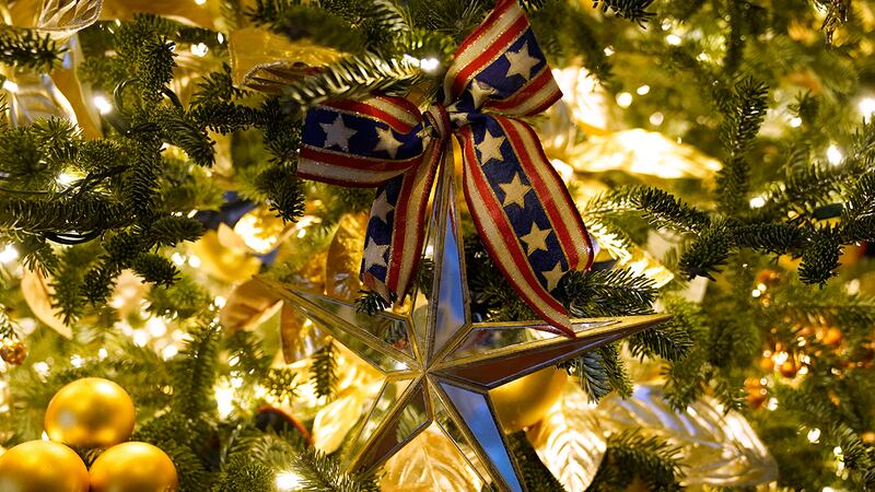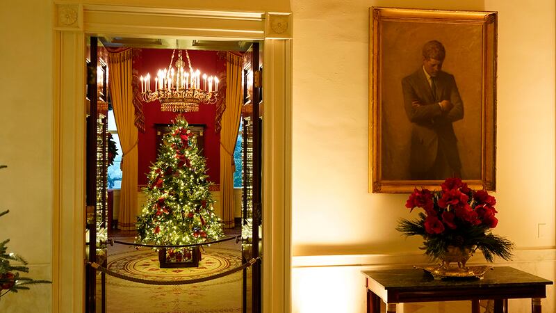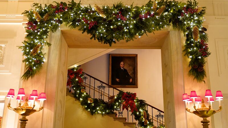 Volunteers from around the country helped decorate the executive mansion after Thanksgiving with 62 Christmas trees, 106 Christmas wreaths, more than 1,200 feet of garland, more than 3,200 strands of lights and 17,000 bows. The White House led the news media on a tour of the decor on Monday before a reception for the volunteers.