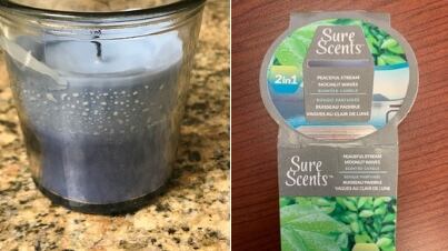 #Recall: Flames on ADCO Sure Scents 2-1 Peaceful Stream/Moonlit Waves Candles, sold @DollarTree, can ignite wax surface or break glass, posing fire & burn hazards. Get refund. CONTACT: 800-876-8697 or https://t.co/AfmwHJKuh1. Recall notice: https://t.co/a5PgAngUmU pic.twitter.com/BNKValLjnM