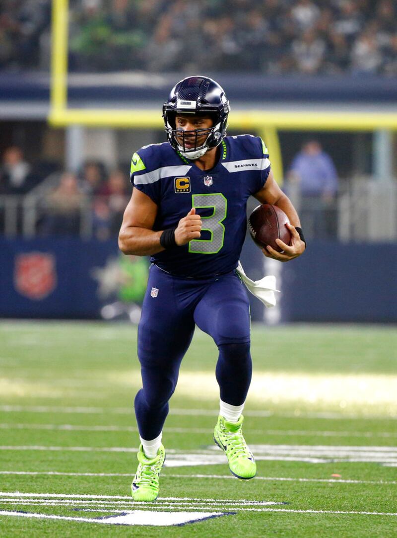 Russell Wilson Seattle Seahawks quarterback Russell Wilson (3) runs the ball against the Dallas Cowboys in the first half of an NFL football game, Sunday, Dec. 24, 2017, in Arlington, Texas. (AP Photo/Michael Ainsworth) (Michael Ainsworth/AP)