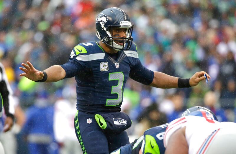 Russell Wilson Seattle Seahawks Russell Wilson calls to his team before taking a snap against the New York Giants in the first half of an NFL football game, Sunday, Nov. 9, 2014, in Seattle. (AP Photo/Elaine Thompson) (Elaine Thompson/AP)