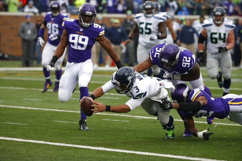 Russell Wilson Seattle Seahawks quarterback Russell Wilson (3) dives for a eight-yard touchdown run as Minnesota Vikings cornerback Antone Exum (32) defensive tackle Tom Johnson (92) try to bring him down in the first half of an NFL football game Sunday, Dec. 6, 2015 in Minneapolis. (AP Photo/Ann Heisenfelt) (Ann Heisenfelt/AP)