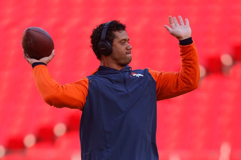 Russell Wilson KANSAS CITY, MISSOURI - JANUARY 01: Russell Wilson #3 of the Denver Broncos warms up prior to the game against the Kansas City Chiefs at Arrowhead Stadium on January 01, 2023 in Kansas City, Missouri. (Photo by David Eulitt/Getty Images) (David Eulitt/Getty Images)