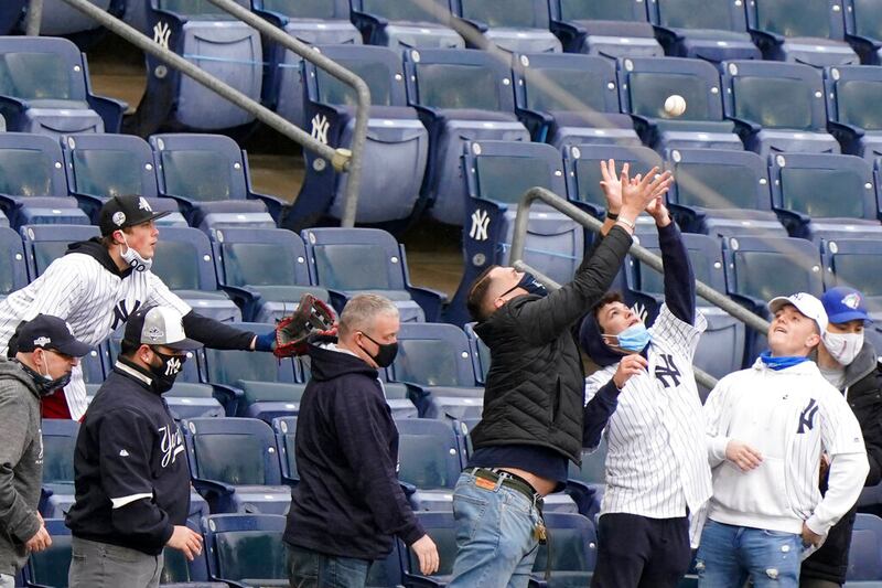 2021 Opening Day Fans in left field reach for a ball bouncing beneath them as the Toronto Blue Jays warmed up before a major league baseball game on opening day at Yankee Stadium, Thursday, April 1, 2021, in New York. (AP Photo/Kathy Willens) (Kathy Willens/AP)