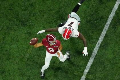 2022 CFP National Championship Alabama's Dallas Turner sacks Georgia's Stetson Bennett during the first half of the College Football Playoff championship football game Monday, Jan. 10, 2022, in Indianapolis. (AP Photo/Paul Sancya) (Paul Sancya/AP)