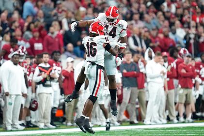 2022 CFP National Championship Georgia's David Daniel and Lewis Cine celebrate after a third down stop during the first half of the College Football Playoff championship football game against Alabama Monday, Jan. 10, 2022, in Indianapolis. (AP Photo/Paul Sancya) (Paul Sancya/AP)