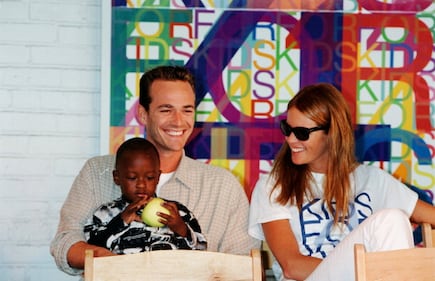 UNITED STATES - MARCH 01: Elle MacPherson stands with Luke Perry at the 'Kids for Kids' benefit carnival October 1, 1995 in New York City. (Photo by The LIFE Picture Collection/Getty Images)