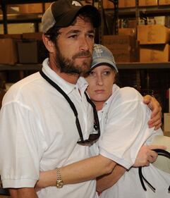NASHVILLE, TN - MAY 14: **EXECUTIVE COVERAGE** Actor Luke Perry, part time Middle Tennessee resident and Publist Kim Dettwiller volunteers with Soles4souls Inc.to bring relief to Nashville flood victims at Soles4Souls Inc. (Rick Diamond/Getty Images)