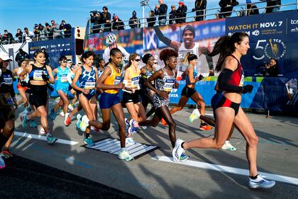 2021 NYC Marathon Athletes in the women's division leave the starting line during the 50th running of the New York City Marathon, Sunday, Nov., 2021. (AP Photo/Craig Ruttle) (Craig Ruttle/AP)
