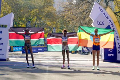 2021 NYC Marathon First place finisher womens Peres Jepchirchir of Kenya, center, poses for a picture with second place finisher Viola Cheptoo of Kenya, left, and third place finisher Ababel Yeshaneh of Ethiopia after crossing the finsih line of the New York City Marathon in New York, Sunday, Nov. 7, 2021. (AP Photo/Seth Wenig) (Seth Wenig/AP)