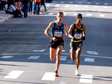 2021 NYC Marathon Mohamed El Aaraby, of Morrocco, and Eyob Faniel, of Italy, lead early during the 50th running of the New York City Marathon, Sunday, Nov., 2021. El Aaraby went on to place second in the event. (AP Photo/Craig Ruttle) (Craig Ruttle/AP)