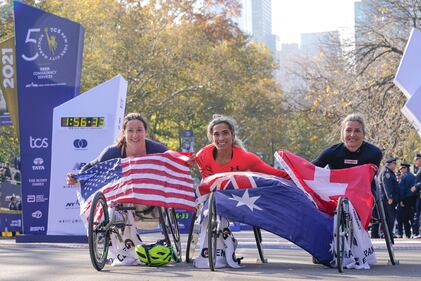 2021 NYC Marathon First place finisher Madison de Rozario of Australia, center, poses for pictures with second place Tatyana McFadden of the United States, left, and third place Manuela Schar of Switzerland after they completed the New York City Marathon in New York, Sunday, Nov. 7, 2021. (AP Photo/Seth Wenig) (Seth Wenig/AP)