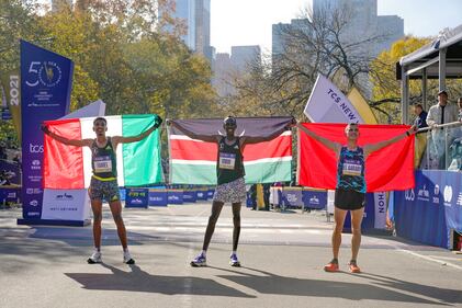 2021 NYC Marathon First place finisher Albert Korir of Kenya poses for a picture during a ceremony at the finish line of the New York City Marathon in New York, Sunday, Nov. 7, 2021. (AP Photo/Seth Wenig) (Seth Wenig/AP)