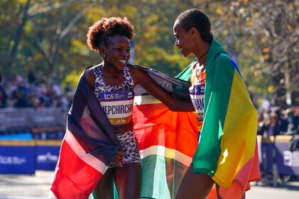 2021 NYC Marathon First place women's finisher Peres Jepchirchir of Kenya, left, greets third place finisher Ababel Yeshaneh of Ethiopia at the finish line of the New York City Marathon in New York, Sunday, Nov. 7, 2021. (AP Photo/Seth Wenig) (Seth Wenig/AP)