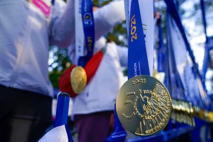 2021 NYC Marathon Volunteers organize medals near the finish line of the New York City Marathon in New York, Sunday, Nov. 7, 2021. (AP Photo/Seth Wenig) (Seth Wenig/AP)