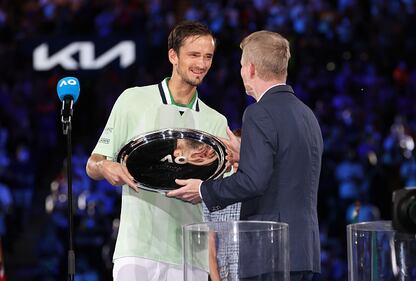 Photos: Rafael Nadal rallies in Australian Open final to win record 21st major Daniil Medvedev of Russia is presented with the his runner-up trophy by Jim Courier after defeat in his Men’s Singles Final match against Rafael Nadal of Spain during Day 14 of the 2022 Australian Open at Melbourne Park on January 30, 2022, in Melbourne, Australia. (Clive Brunskill/Getty Images)