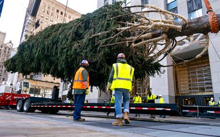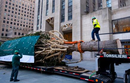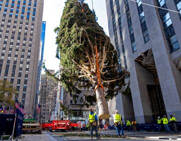 Rockefeller Center Christmas tree arrives in New York A worker walks across the trunk of the 2020 Rockefeller Center Christmas tree, a 75-foot tall Norway Spruce that was acquired in Oneonta, N.Y., as it is prepared for setting on a platform at Rockefeller Center Saturday, Nov. 14, 2020, in New York. (AP Photo/Craig Ruttle) (Craig Ruttle/AP)