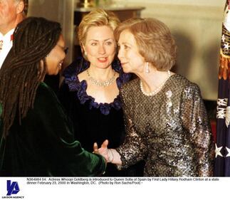 Through the years Actress Whoopi Goldberg is introduced to Queen Sofia of Spain by First Lady Hillary Rodham Clinton at a state dinner February 23, 2000 in Washington, DC. (Photo by Ron Sachs/Pool) (Pool/Getty Images)