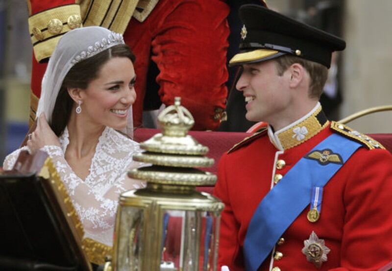 Britain's Prince William and his wife Kate, Duchess of Cambridge, left, smiles as they leave Westminster Abbey at the Royal Wedding in London Friday, April 29, 2011. (Gero Breloer ASSOCIATED PRESS)