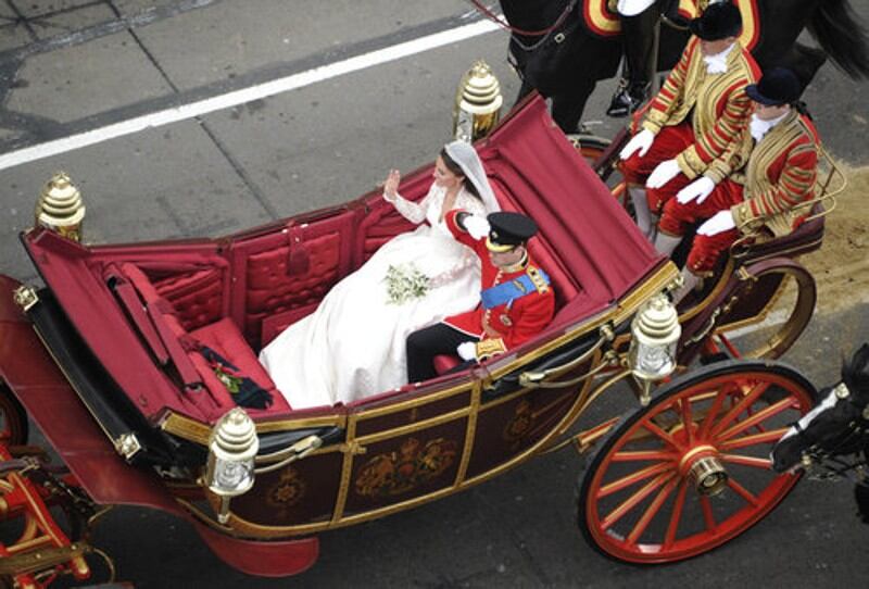 Britain's Prince William and Kate, the Duchess of Cambridge, wave as they travel in the 1902 State Landau carriage along the processional route to Buckingham Palace, London, Friday April 29, 2011. (Damien Meyer ASSOCIATED PRESS)