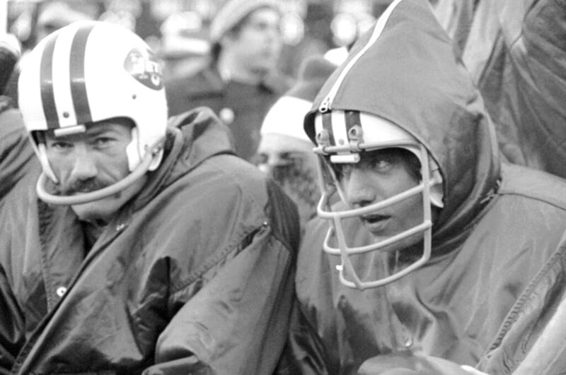 Don Maynard FILE - New York Jets' Don Maynard, left, and Joe Namath watch from the bench dureing a football game against the Cleveland Browns Jets quarterback Joe Namath, resting an ankle injury, nestles against the cold as he sits out game against Cleveland Browns at Shea Stadium in New York on Dec. 17, 1972. In some shots wide receiver Don Maynard (single face bar) sits next to him. Don Maynard, a Hall of Fame receiver who made his biggest impact catching passes from Joe Namath in the wide-open AFL, has died. He was 86. The Pro Football Hall of Fame confirmed Maynard's death on Monday, Jan. 10, 2022, through his family.(AP Photo/Harry Harris, File) (Harry Harris/AP)