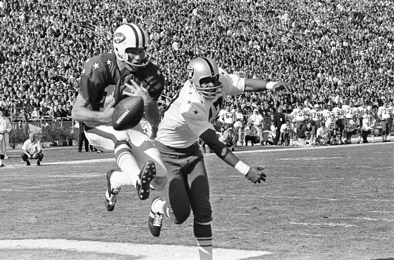Don Maynard East All-Star flanker Don Maynard (13) goes high in the air only to lose a pass in the end zone from East quarterback Joe Namath, both of the New York Jets in the AFL, All-Star game in Jacksonville, Fla., Jan. 21, 1968. Breaking up the pass is West All-Star back from Kansas City Johnny Robinson (42). (AP Photo) (Anonymous/AP)
