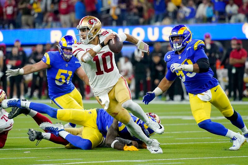 2022 NFC Championship San Francisco 49ers' Jimmy Garoppolo scrambles during the second half of the NFC Championship NFL football game against the Los Angeles Rams Sunday, Jan. 30, 2022, in Inglewood, Calif. The Rams won 20-17 to advance to the Super Bowl. (AP Photo/Mark J. Terrill) (Mark J. Terrill/AP)