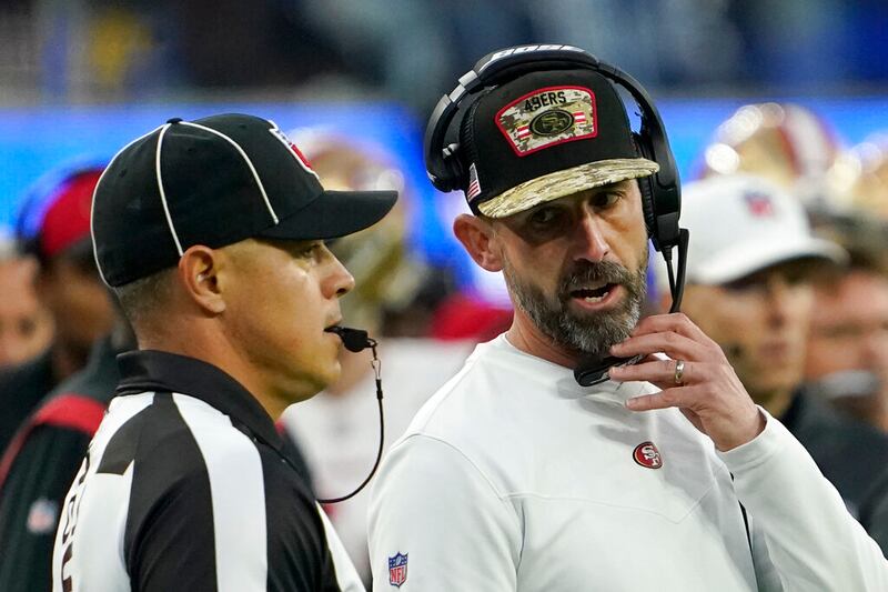 2022 NFC Championship Game San Francisco 49ers head coach Kyle Shanahan, right, argues a call during the first half of the NFC Championship NFL football game against the Los Angeles Rams Sunday, Jan. 30, 2022, in Inglewood, Calif. (AP Photo/Elaine Thompson) (Elaine Thompson/AP)