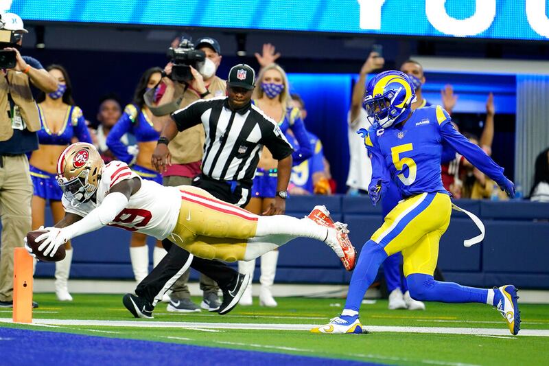 2022 NFC Championship Game San Francisco 49ers' Deebo Samuel, bottom, dives into the end zone in front of Los Angeles Rams' Jalen Ramsey (5) for a touchdown during the first half of the NFC Championship NFL football game Sunday, Jan. 30, 2022, in Inglewood, Calif. (AP Photo/Marcio Jose Sanchez) (Marcio Jose Sanchez/AP)