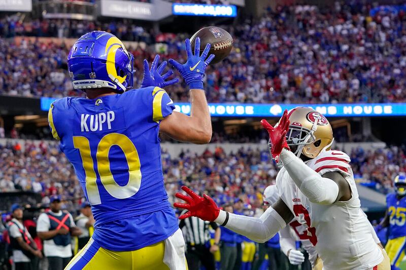 2022 NFC Championship Game Los Angeles Rams' Cooper Kupp, right, catches a pass during the first half of the NFC Championship NFL football game against the San Francisco 49ers Sunday, Jan. 30, 2022, in Inglewood, Calif. (AP Photo/Marcio Jose Sanchez) (Marcio Jose Sanchez/AP)