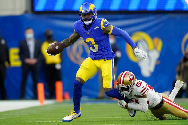 2022 NFC Championship Game San Francisco 49ers' Ambry Thomas, bottom, stops Los Angeles Rams' Odell Beckham Jr. during the first half of the NFC Championship NFL football game Sunday, Jan. 30, 2022, in Inglewood, Calif. (AP Photo/Mark J. Terrill) (Mark J. Terrill/AP)