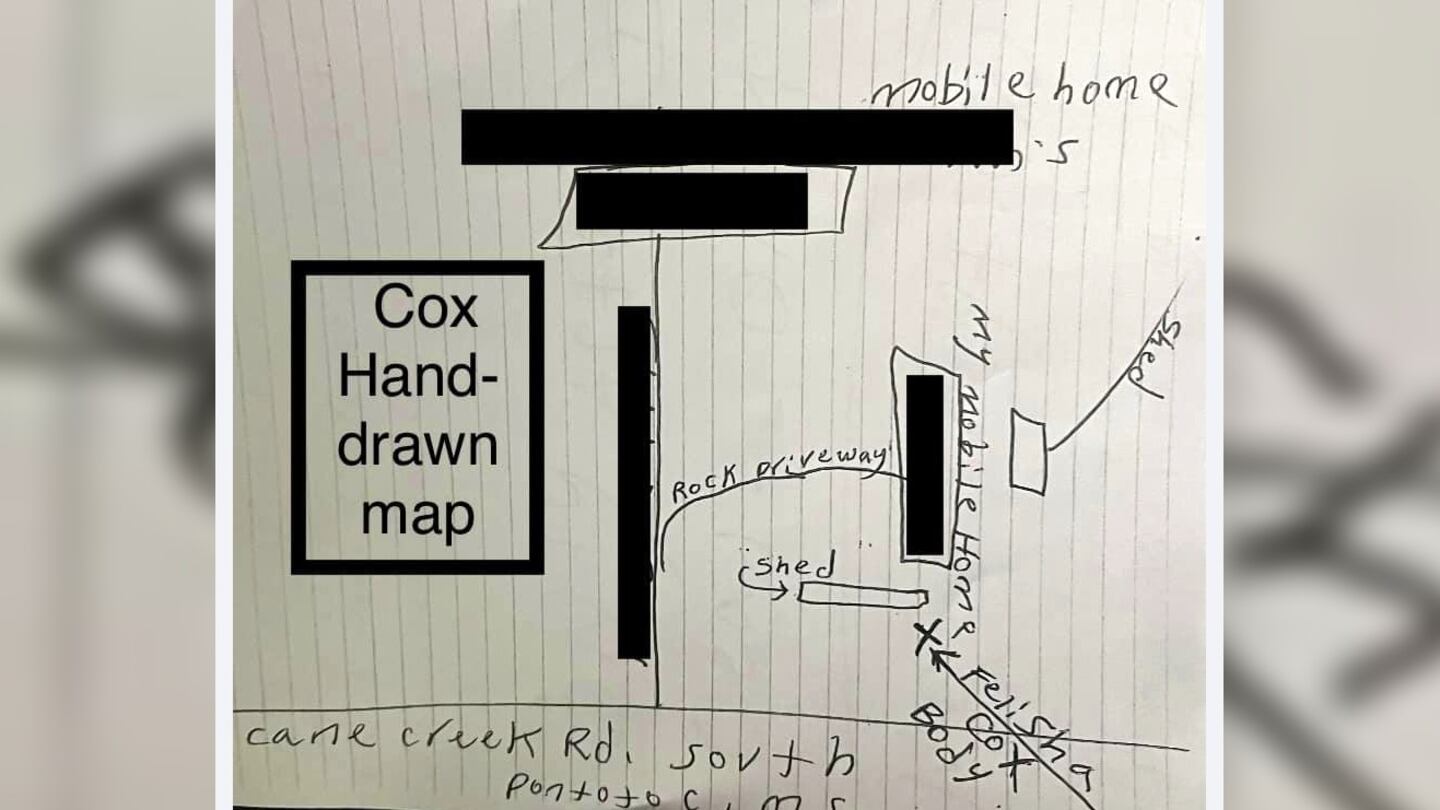 The next day, the defense turned over a letter from Cox, along with a hand-drawn map marking the location of the remains. Authorities used satellite imagery to compare the location in 2007 and today.