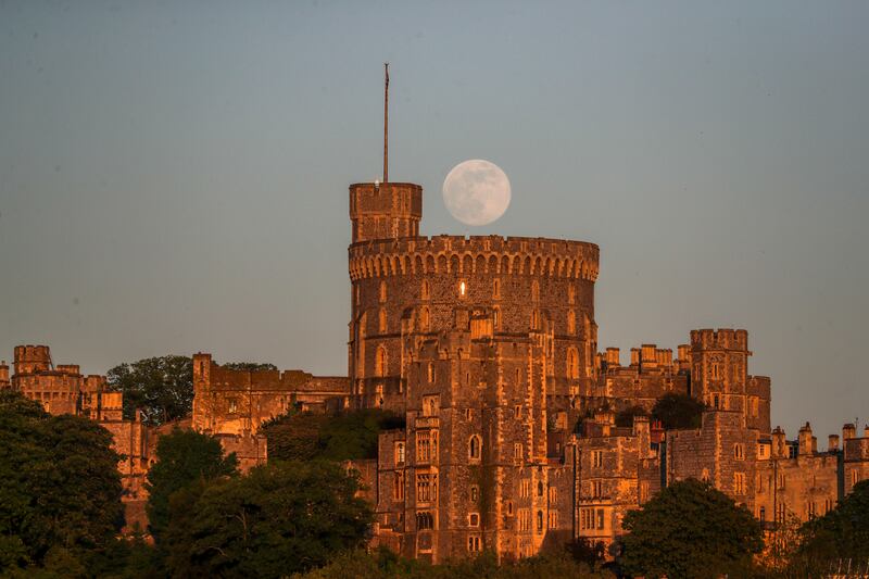 Super flower moon 2020 The moon rises over Windsor Castle in Berkshire ahead of the final supermoon of the year, which will be visible over the UK on Thursday evening. (Steve Parsons/PA Images via Getty Images)