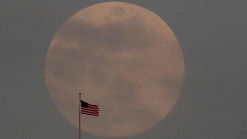 Super flower moon 2020 A U.S. flag on top of the Kansas City, Mo., city hall building stands against the rising full moon, Wednesday, May 6, 2020. (AP Photo/Charlie Riedel)