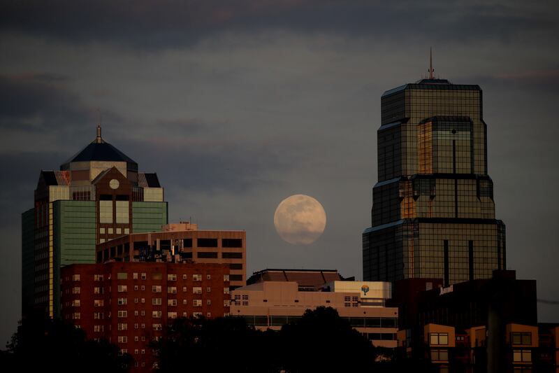 Super flower moon 2020 The full moon rises beyond downtown office buildings, Wednesday, May 6, 2020, in Kansas City, Mo. (AP Photo/Charlie Riedel)