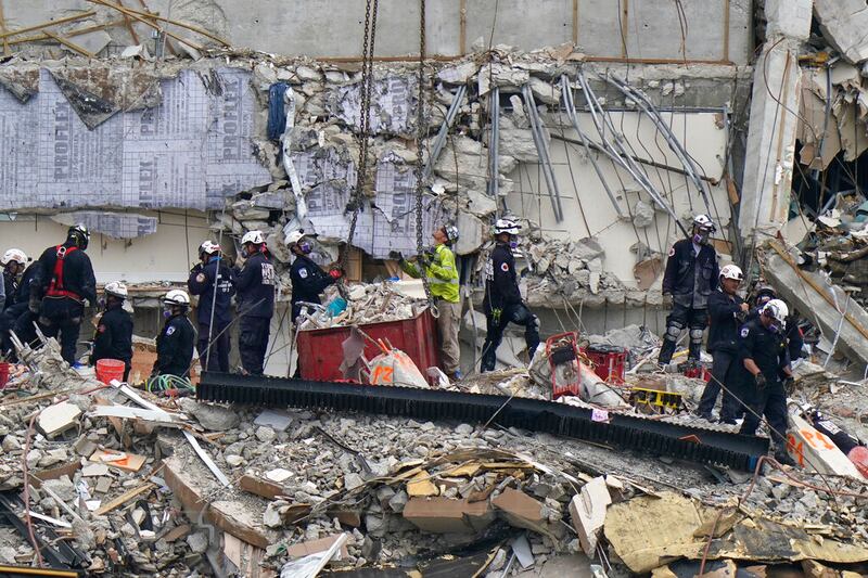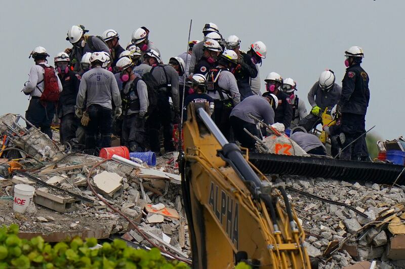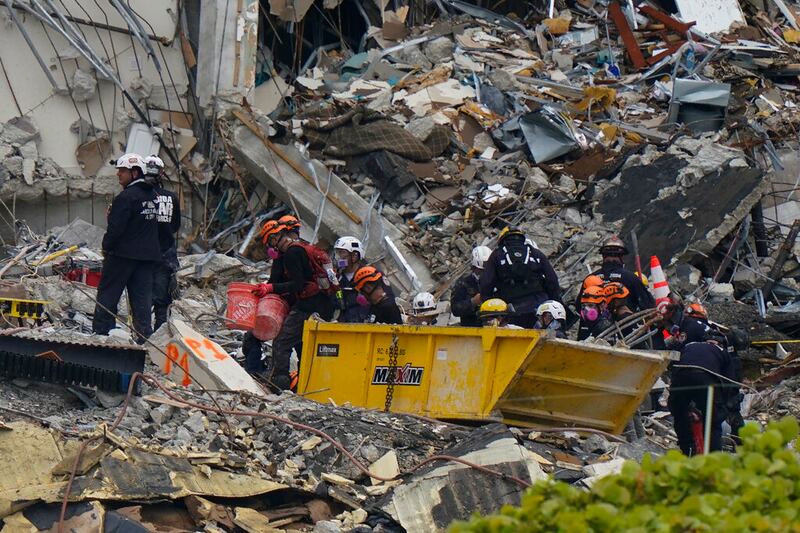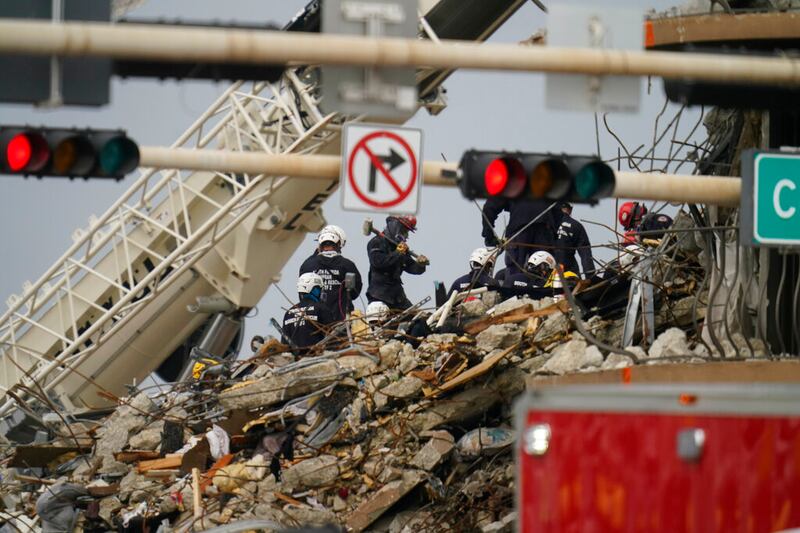 Surfside collapse Rescue workers search in the rubble at the Champlain Towers South condominium, Wednesday, June 30, 2021, in the Surfside area of Miami. Many people are still unaccounted for after the building partially collapsed last Thursday. (AP Photo/Lynne Sladky) (Lynne Sladky/AP)