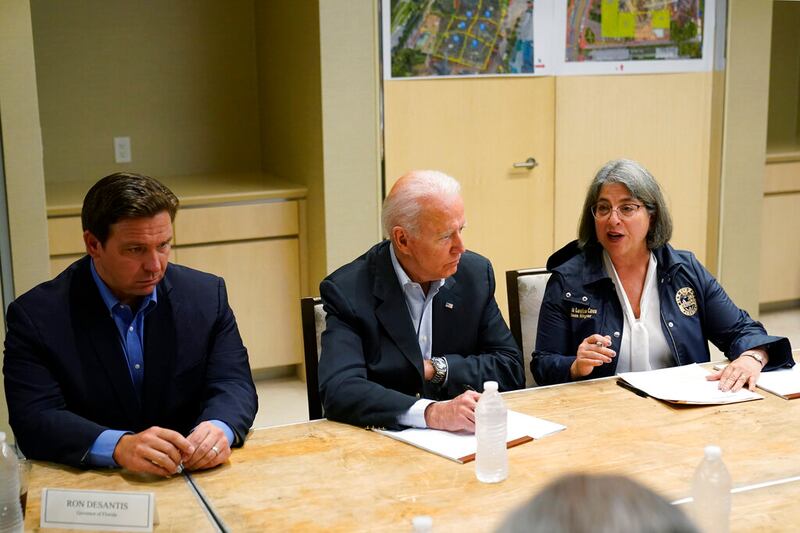 Surfside collapse President Joe Biden, center, listens as Incident Commander Mayor Daniella Levine Cava, right, speaks during a briefing with Florida Gov. Ron DeSantis, left, first responders and local officials in Miami Beach, Fla., Thursday, July 1, 2021, on the condo tower that collapsed in Surfside, Fla., last week. (AP Photo/Susan Walsh) (Susan Walsh/AP)