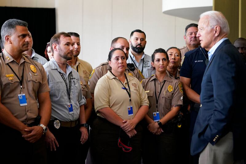 Surfside collapse President Joe Biden meets with first responders in Miami Beach, Fla., Thursday, July 1, 2021, who were working on the condo tower that collapsed in Surfside, Fla., last week. (AP Photo/Susan Walsh) (Susan Walsh/AP)